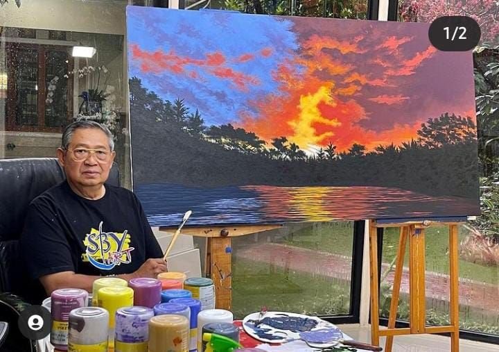 Mantan Presiden Susilo Bambang Yudhoyono atau SBY dengan lukisan yang dibuatnya. Lukisan itu terinspirasi dari foto-foto yang dibuat mendiang istrinya, Ani Yudhoyono.