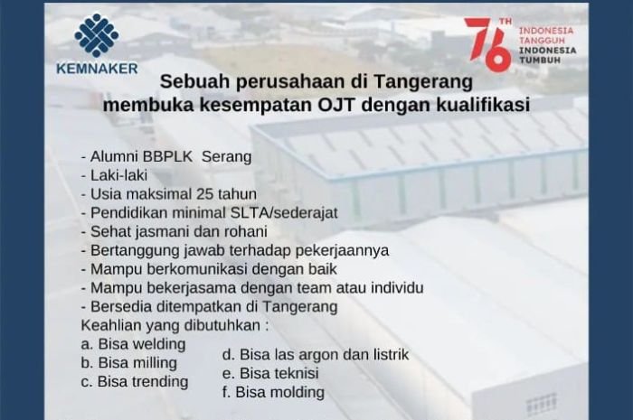 Dikutip Bantenraya.com dari Instagram @bbplk_serang, berikut syarat dan kualifikasi yang diajukan perusahaan di Tangerang untuk ikut pelatihan bagi pekerja baru.