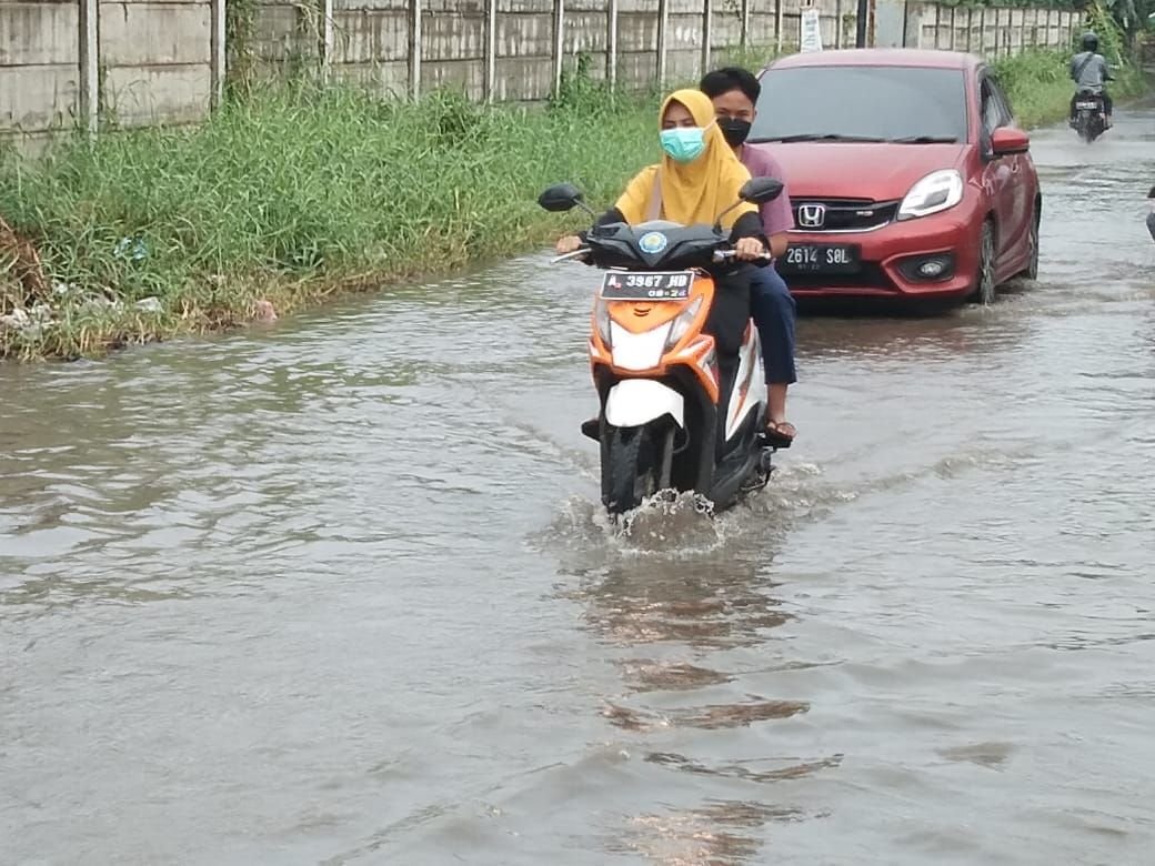 Jalan Serdang-Waringinkurung, tepatnya di Desa Harjatani, Kecamatan Kramatwatu, Kabupaten Serang tergenang akibat hujan, Selasa, 7 September 2021. Ahmad Marjuki/Banten Raya