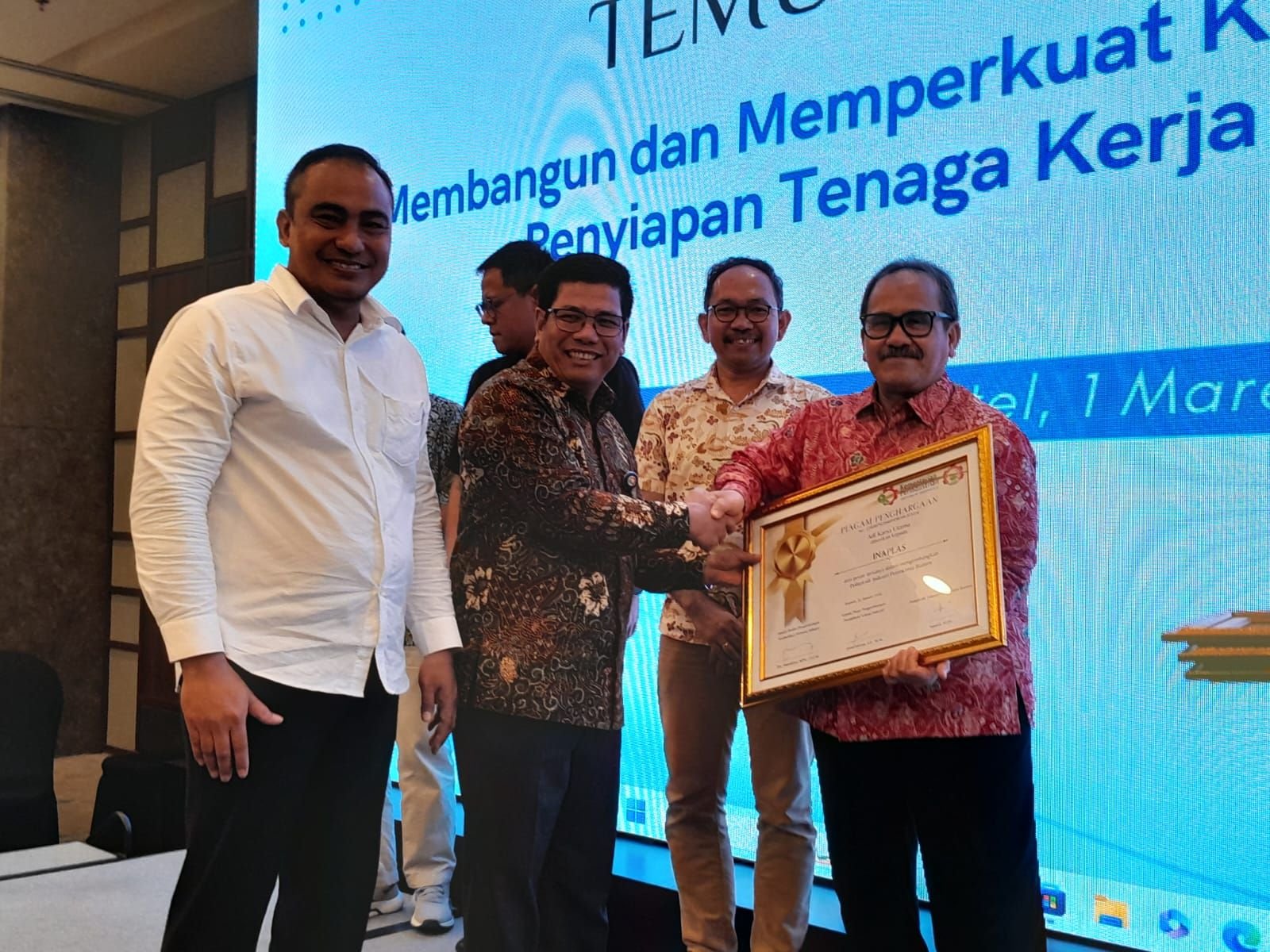 Kepala PPPVI Kementerian Perindustrian RI Joni Afrizon menyerahkan piagam kepada pihak industri yang telah bekerja sama, Jumat 1 Maret 2024. Tanjung/ bantenraya