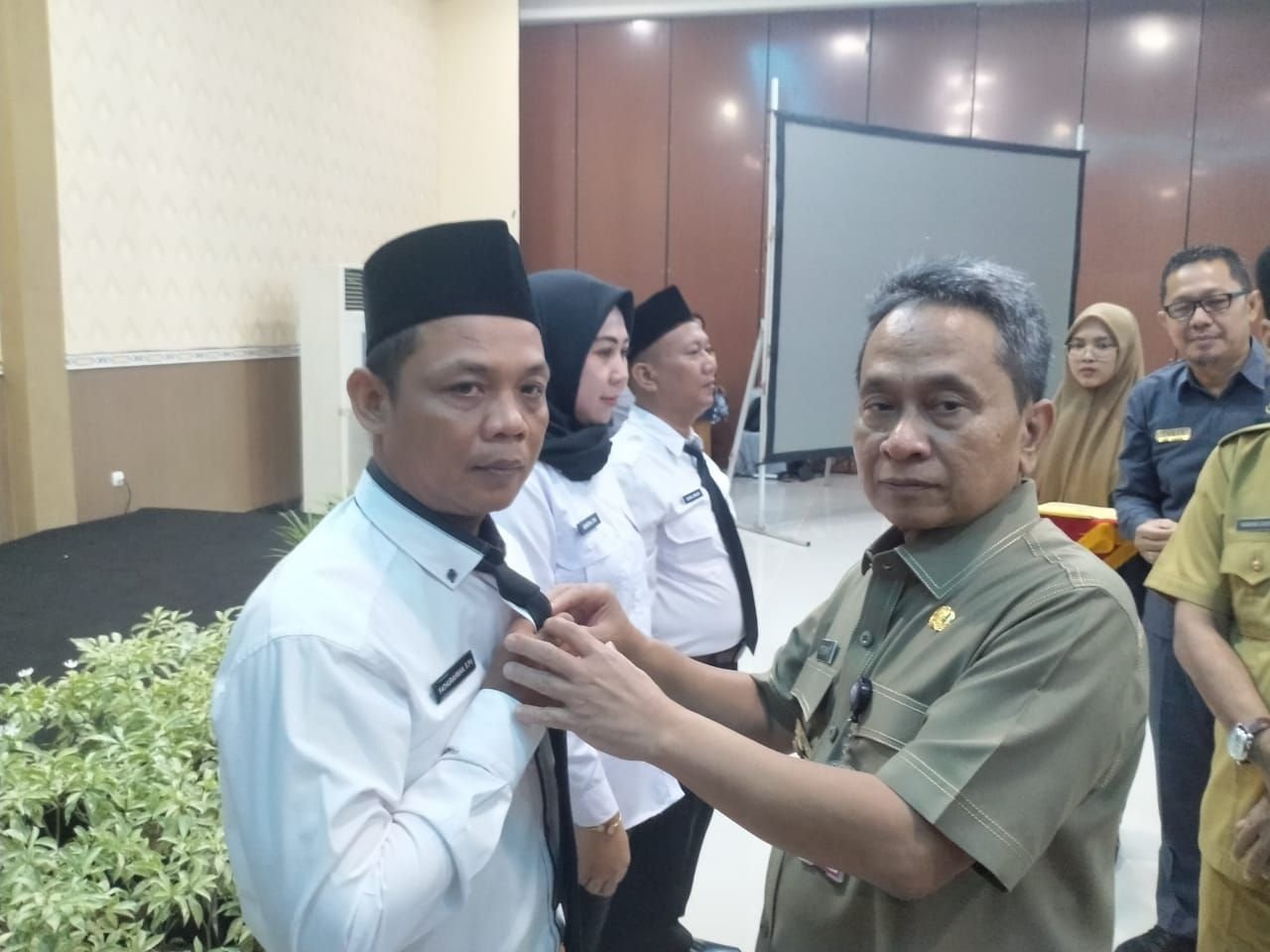 Pj Walikota Serang Yedi Rahmat menyematkan pin kepada PPPK yang baru saja dilantik di Convention Hall Unbaja, Kecamatan Curug, Kota Serang, Selasa 5 Maret 2024. Harir Baldan/Bantenraya.com