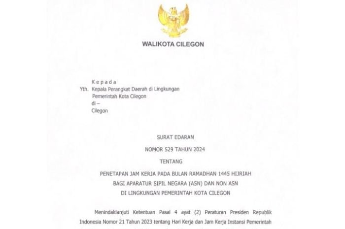 Dimana, edaran Walikota Cilegon itu berkaitan tentang Penetapan Jam Kerja Pada Bulan Ramadhan 1445 Hijriyah bagi ASN dan Non ASN di Lingkungan Pemkot Cilegon.
