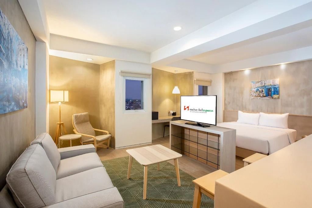 Ada jenis kamar Express Studio dengan luas ruangan 34 meter persegi dengan tempat tidur ruang pertemuan dan beberapa fasilitas lainnya.