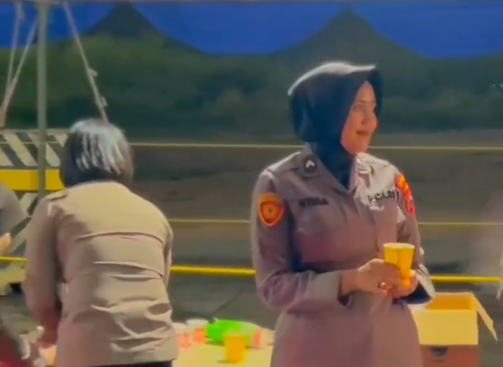 Kemudian terlihat para polisi dan petugas membagikan air dan kopi kepada pemudik di sana.