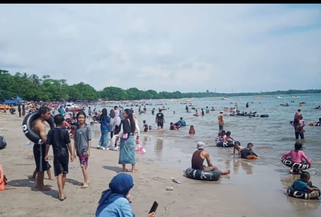 Ratusan pengunjung memadati kawasan obyek wisata Pantai Carita, Kecamatan Carita, Kabupaten Pandeglang, Senin 14 April 2024. Yanadi/bantenraya.com
