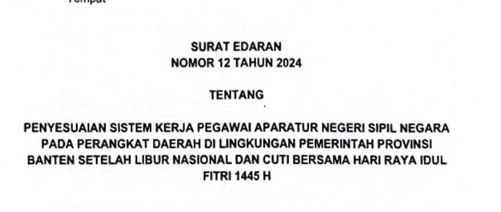 Aturan kerja WFH itu tertera dalam Surat Edaran (SE) Nomor 12 Tahun 2024 tentang Penyesuaian Sistem Kerja Pegawai Aparatur Negeri Sipil Negara pada Perangkat Daerah di Lingkungan Pemerintah Provinsi Banten Setelah Libur Nasional dan Cuti Bersama Hari Raya Idul Fitri 1445 H yang ditandatangani Penjabat (Pj) Gubernur Banten Al Muktabar.