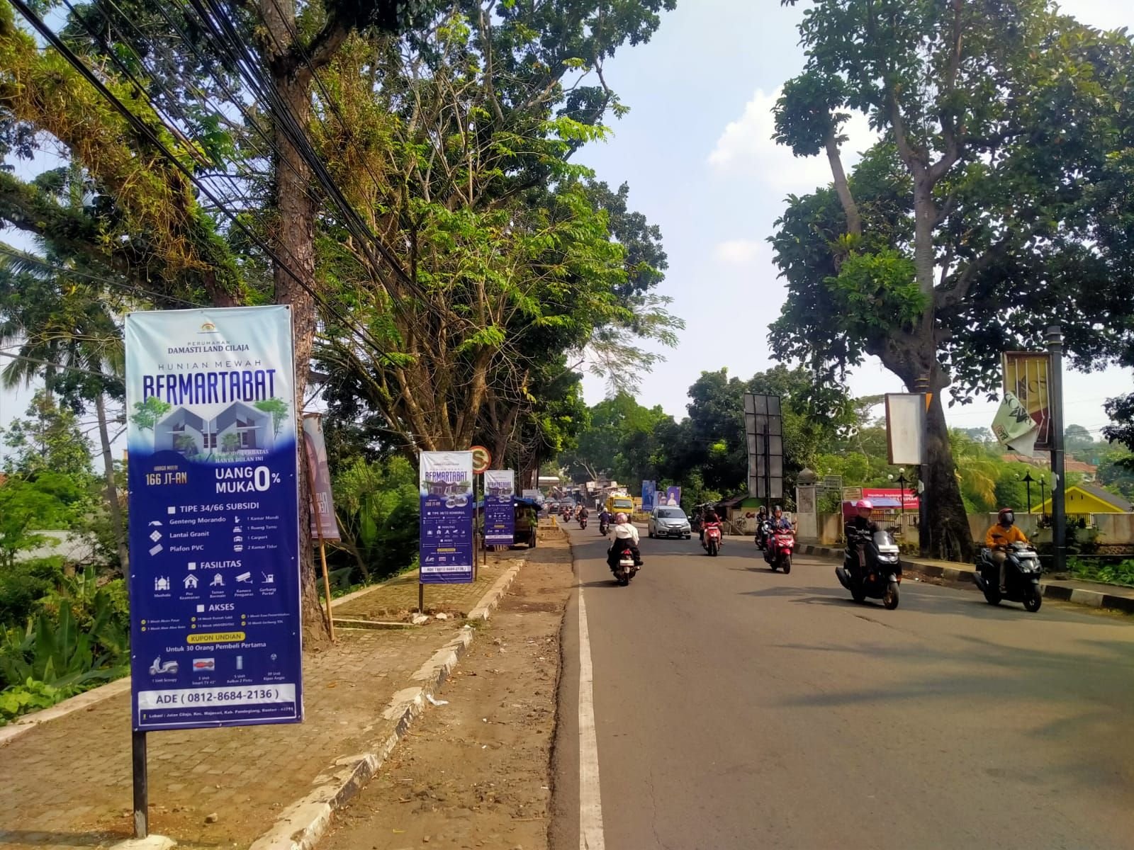 Sejumlah baliho berkonten iklan perumahan tertanam secara permanen hingga hampir menutupi trotoar di simpang tiga perkantoran Cikupa, Pandeglang. Tepat bersebrangan dengan kantor DPUPR Pandeglang, Senin, 10 Juni 2024. Aldi/Bantenraya.com