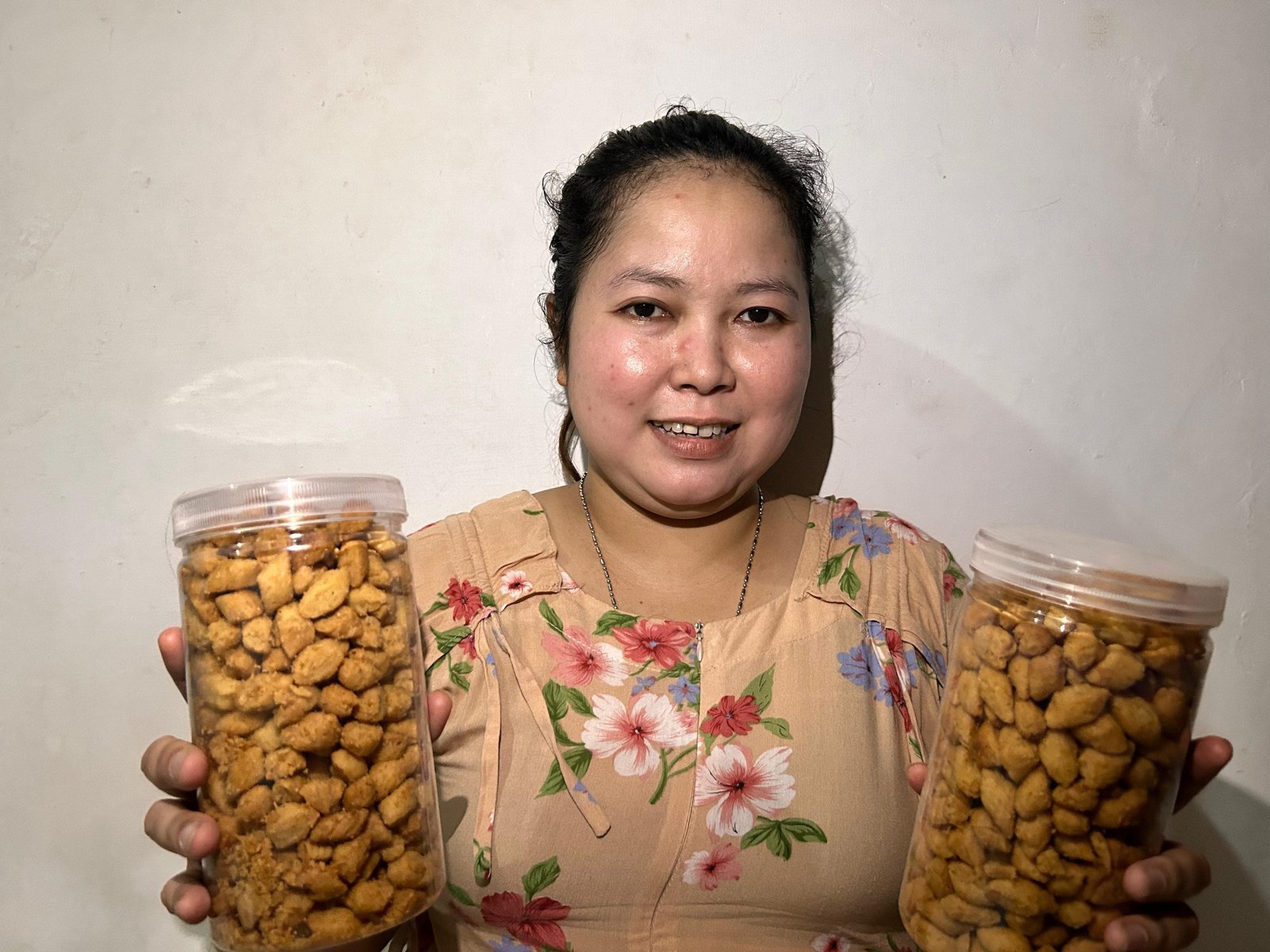 Nastar dalam kemasan toples 500 gram dijual seharga Rp60 ribu, sagu keju Rp55 ribu, putih salju Rp60 ribu, kemudian ada biji ketapang Rp40 ribu dalam kemasan 600 gram. Neneng juga menjual peyek kemasan toples 5 liter seharga Rp40 ribu.