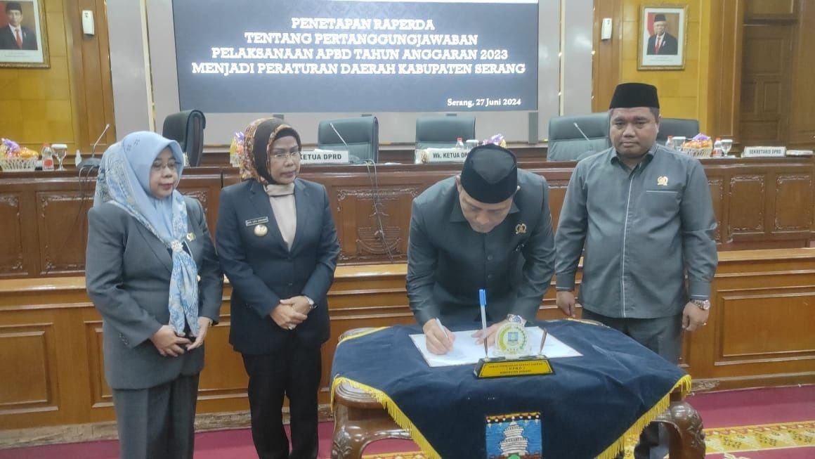 Sementara itu, juru bicara Raperda tentang pertanggung jawaban pelaksanaan APBD tahun anggaran 2023 Ikhwan Badrudin mengatakan, badan anggaran (Banggar) DPRD Kabupaten serang memberikan beberapa catatan terhadap raperda tersebut di antarannya, banggar meminta dalam pengelolaan dan penatausahaan APBD harus lebih tertib dalam administrasi serta berpedoman pada peraturan perundang-undangan yang berlaku.
