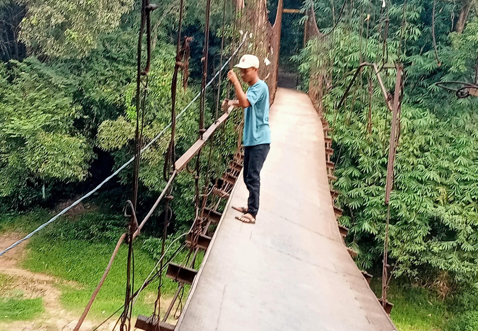 “Dulu jembatan gantung ini bisa dilalui oleh kendaraan roda dua, tapi setelah kondisinya miring warga yang menggunakan sepeda motor harus memutar arah dengan jarak yang cukup jauh, udah puluhan tahun kurang lebih,” jelasnya.