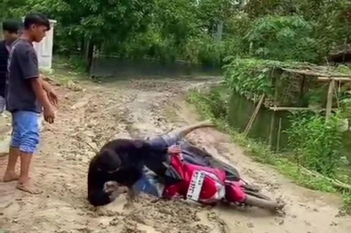 Pura-pura jatuh dari motor dilakukan untuk menyindir pemerintah agar tidak tutup mata dan segera memerbaiki jalan tersebut.