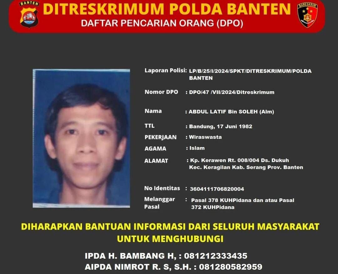 “Bahwa benar ditreskrimum Polda Banten telah menerbitkan Daftar Pencarian orang atas nama tersangka Abdul Latif yang diduga telah melakukan tindak pidana penipuan atau penggelapan,” katanya kepad awak media, Minggu (4/8/2024).