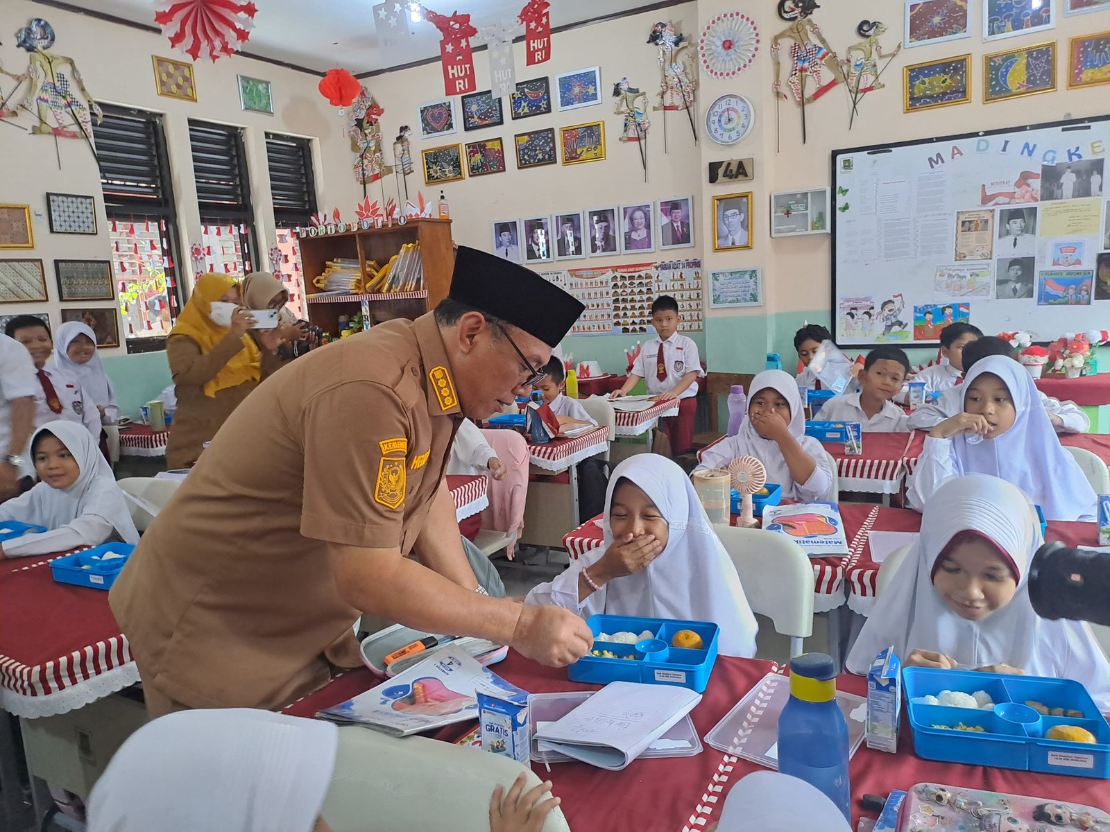 Helldy Agustian menyuapi siswa saat gladi bersih program makan bergizi gratis Uri/Bantenraya.com