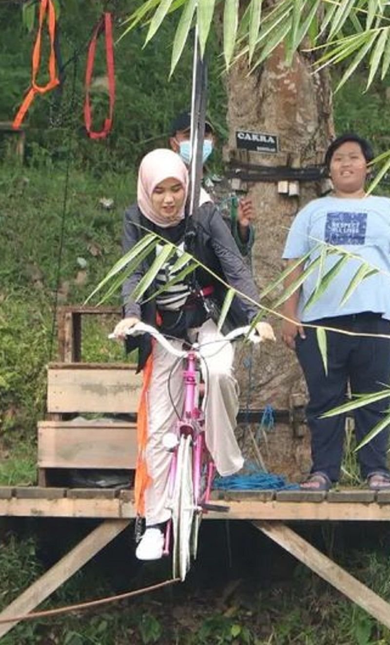Seorang pengunjung wahana menjajal wahana sepeda terbang Hudaya
