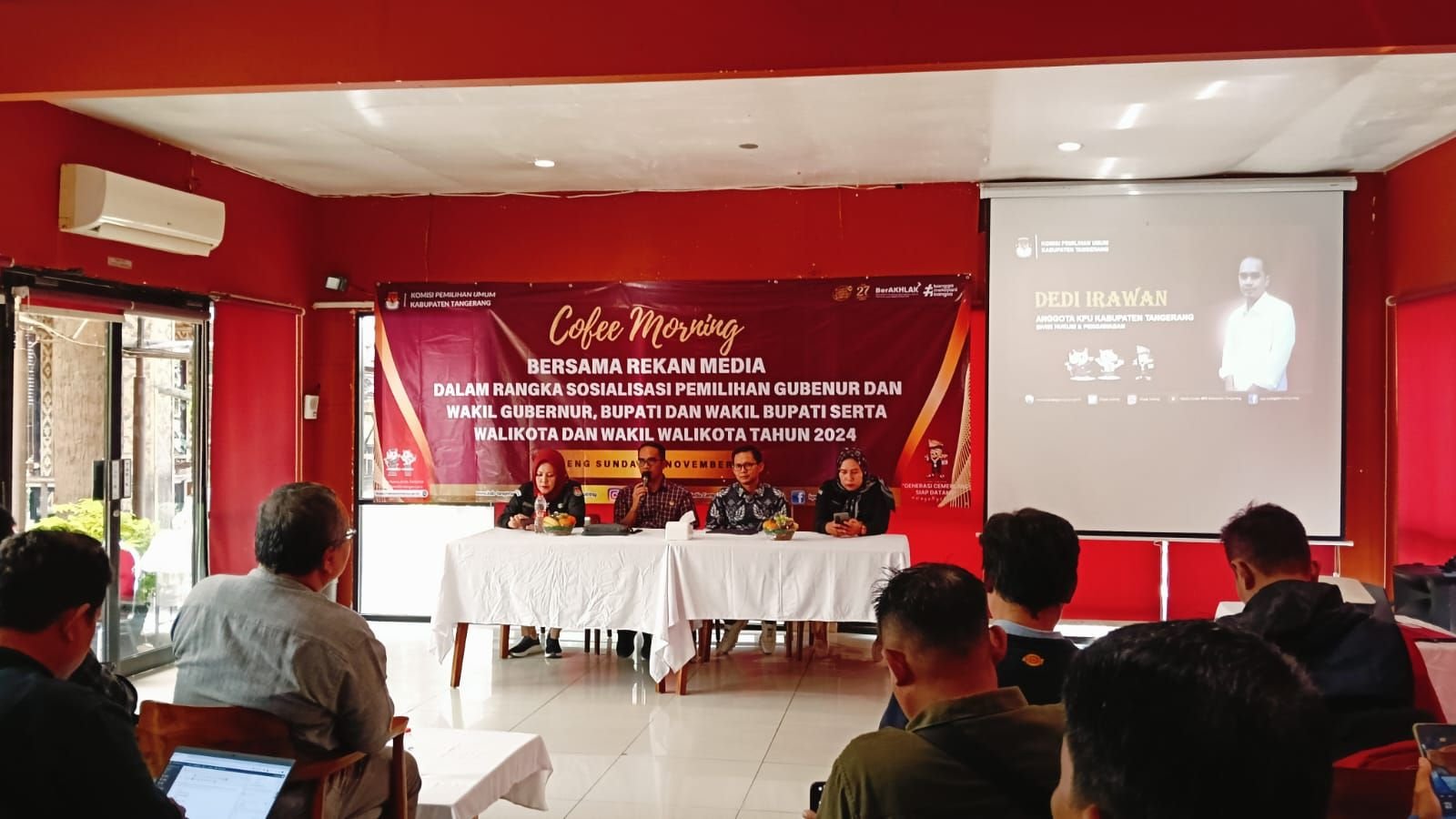 Pada kegiatan tersebut dihadiri Anggota KPU Kabupaten Tangerang Divisi Hukum dan Pengawasan Dedi Irawan dan Wakil Ketua Komisi Penyiaran Indonesia Daerah atau KPID Banten A. Solahudin.