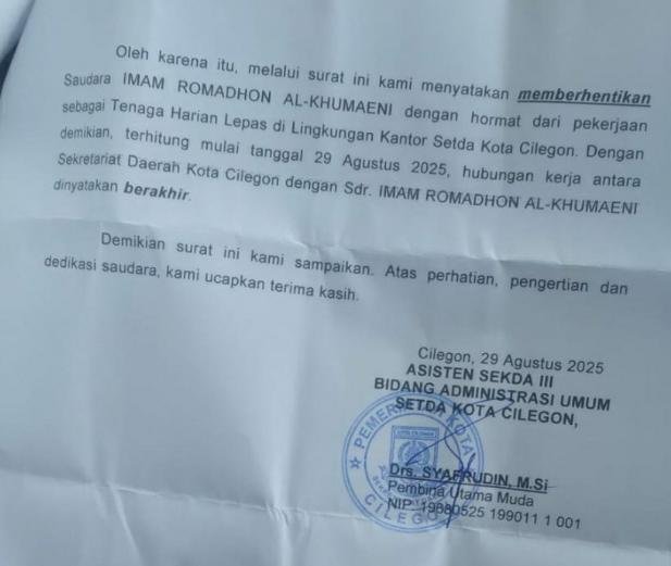 Surat pemecatan Honorer Pemkot Cilegon Imam Romadon Al-Khumaeni tertanggal 29 Agustus 2025 itu baru diberikan 10 hari kemudian atau 9 September 2025.