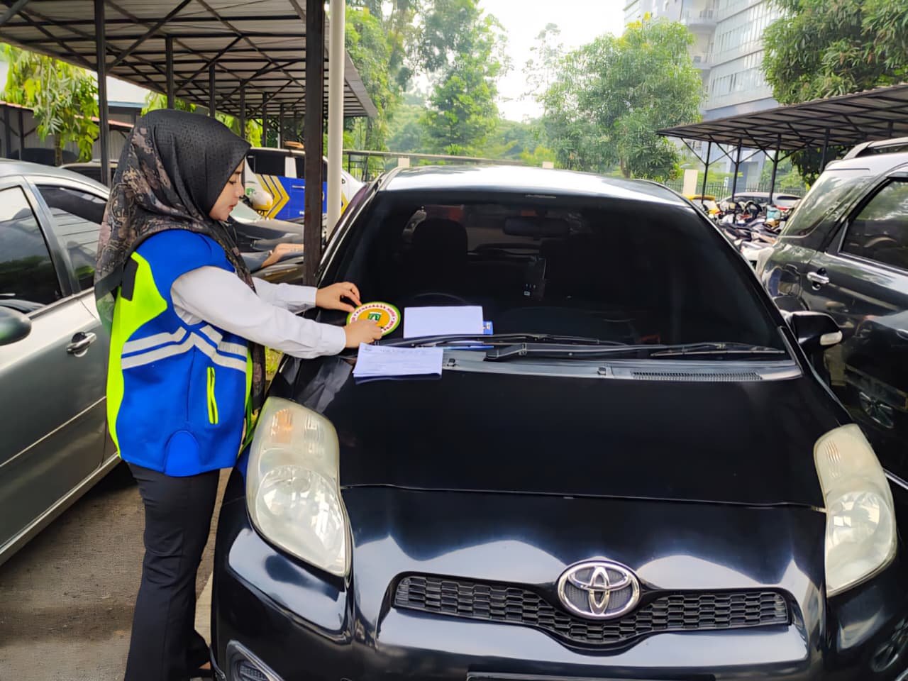 Petugas Bapenda memeriksa kendaraan dinas dan pribadi milik ASN. Kendaraan yang menunggak pajak langsung ditempeli stiker besar bertuliskan “Kendaraan Anda Belum Membayar Pajak” sebagai peringatan.