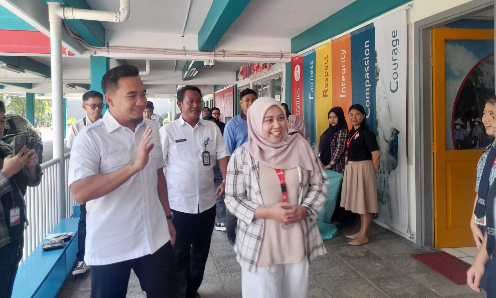 Walikota Cilegon Robinsar (kiri) mengunjungi SMP Berbasis Internasional Singapore Intercultural School (SIS) Group of Schools Cilegon dan memastikan tidak akan ada lagi sekolah negeri rusak dan meja bolong di Kota Cilegon, Rabu 24 September 2025. (Uri/Bantenraya.com)
