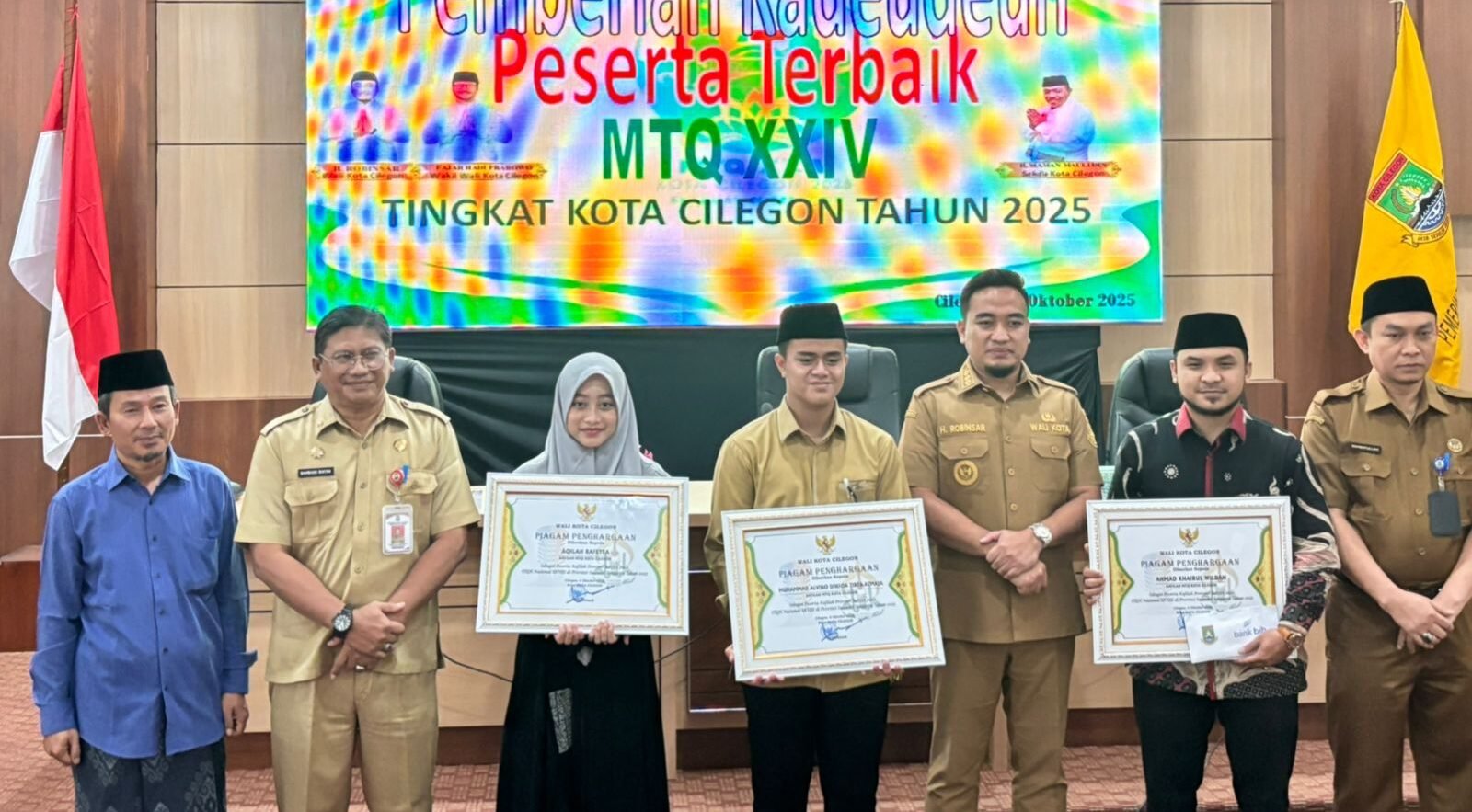 Walikota Cilegon Robinsar melepas 3 warga Cilegon yang akan mengikuti MTQ tingkat nasional di Aula Setda Cilegon, Senin 6 Oktober 2025. (Tia/Banten Raya)