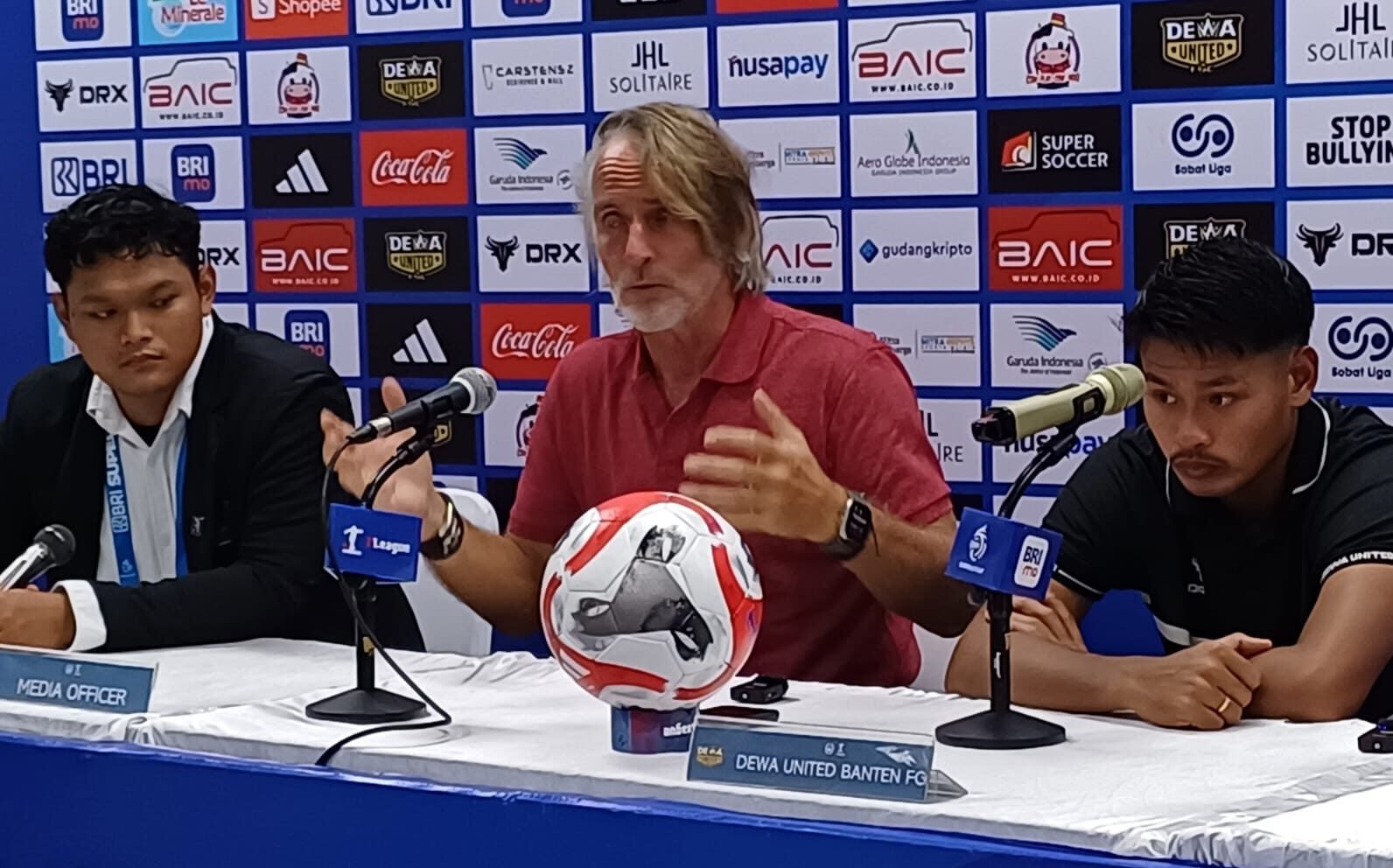 Pelatih Dewa United Jan Olde Riekerink memberikan keterangan terkait pemanggilan 3 pemain ke Timnas Indonesia belum lama ini. (hendra/Banten raya)