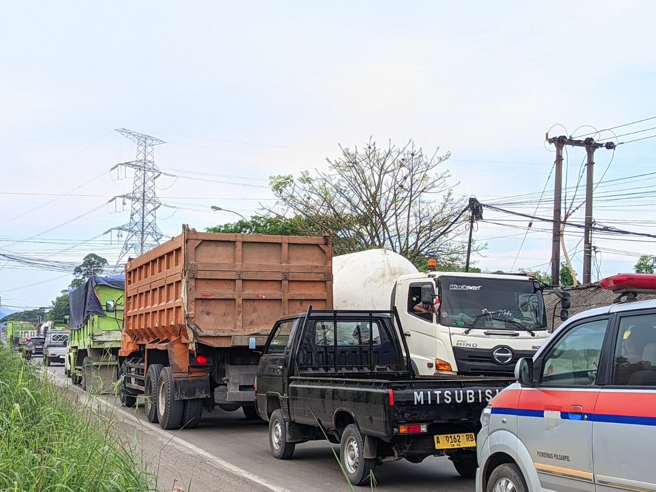 Kendaraan truk tambang menumpuk dan membuat macet di depan depan Pergudangan Permata, Jalan raya Bojonegara-Puloampel, Senin 5 Oktober 2025. (Andika/Bantenraya.com)