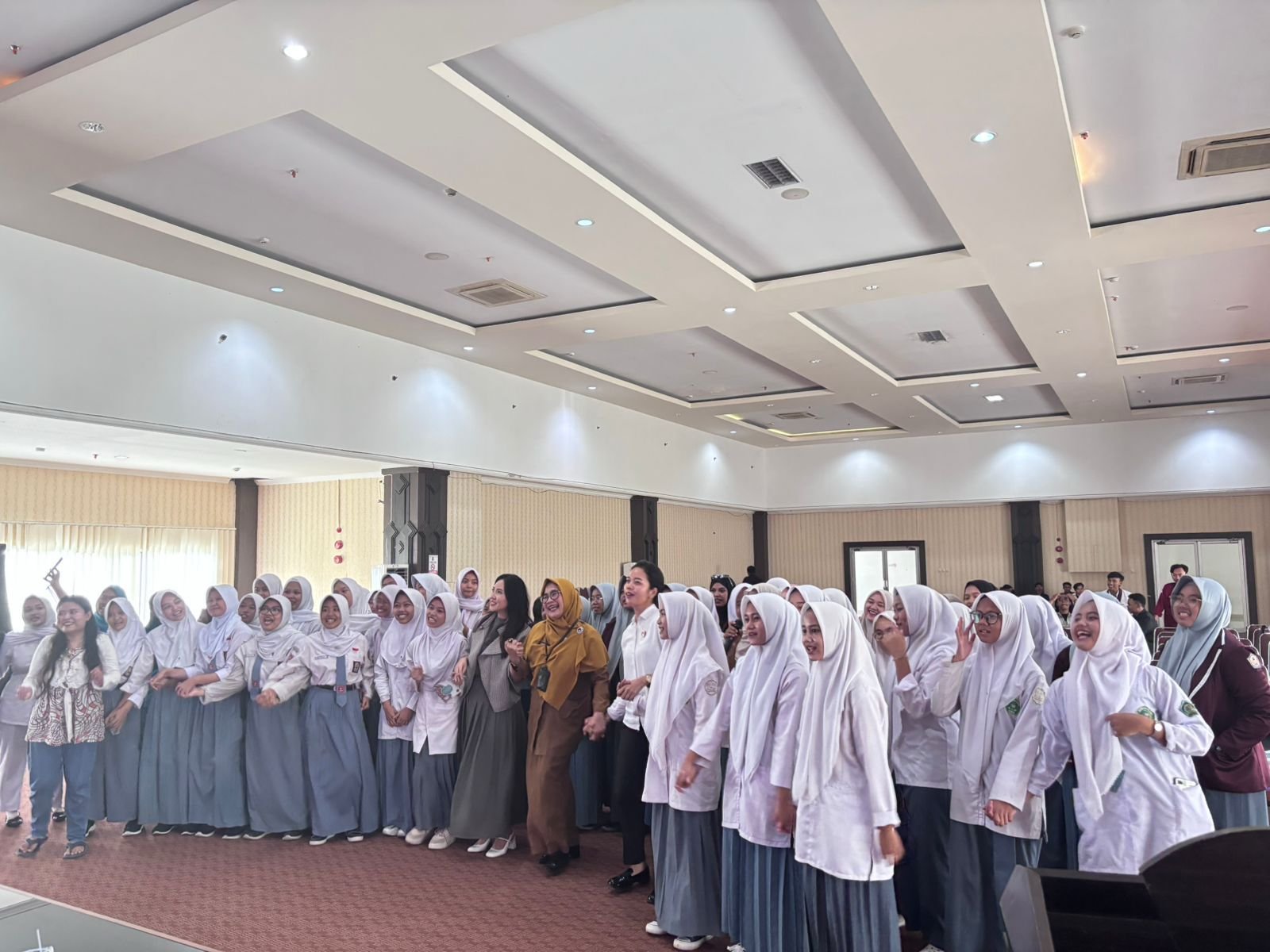 Ketua GOW Kota Cilegon Nur Kusuma Ngarasati bernyanyi bersama anak-anak sekolah usai Seminar Kewadonan dengan Tema Perempuan Berdaya Lawan Pelecehan Seksual di Aula Diskominfo Kota Cilegon, Senin 13 Oktober 2025. (Tia/Banten Raya)