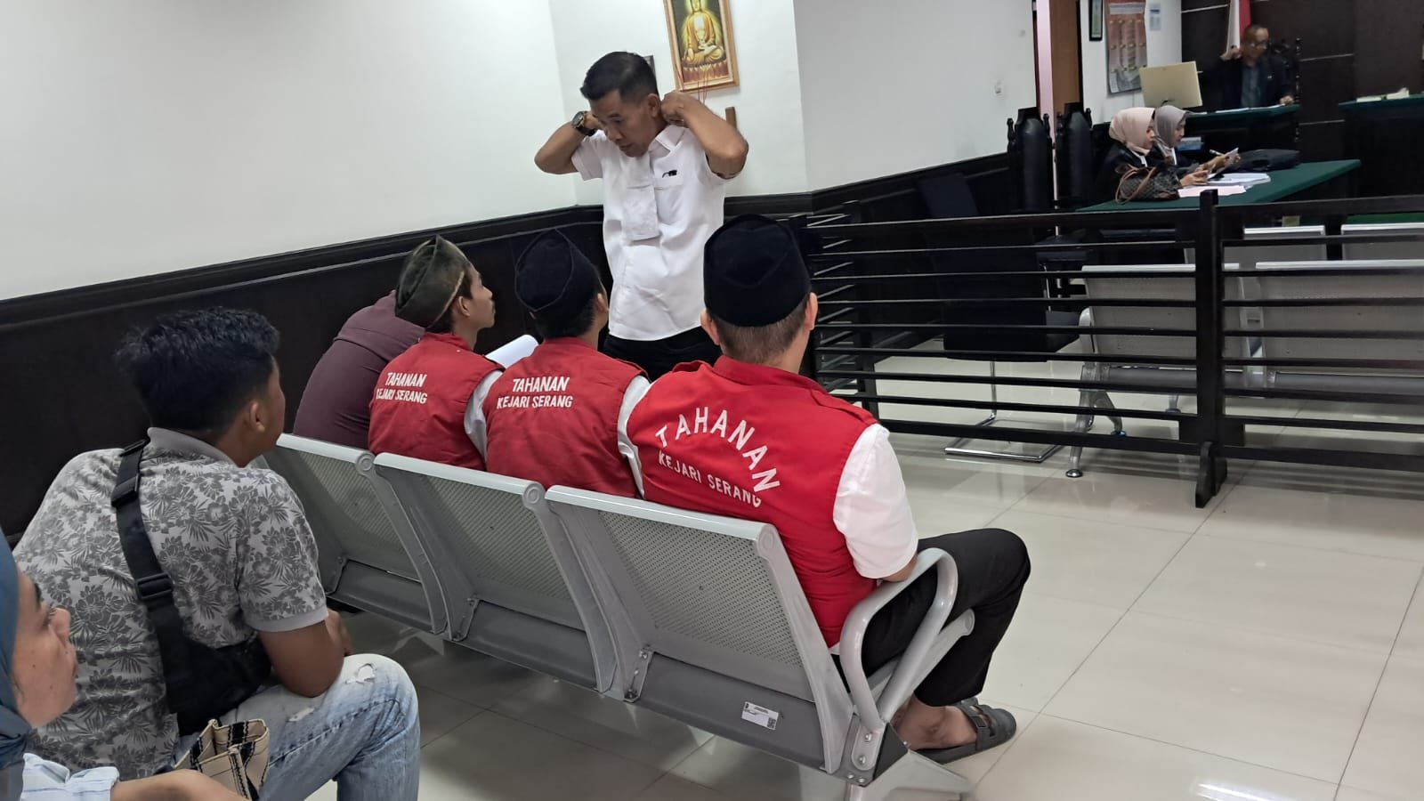 Terdakwa Adietya (samping kanan rompi merah-red) menunggu jalannya persidangan di Pengadilan Negeri Serang, Rabu 15 Oktober 2025. (Darjat/Bantenraya.com)