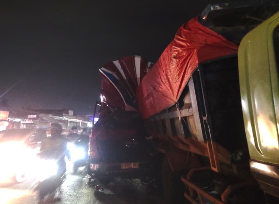 Tabrakan beruntun diduga disebabkan adanya truk tambang yang parkir sembarangan pada bahu jalan.