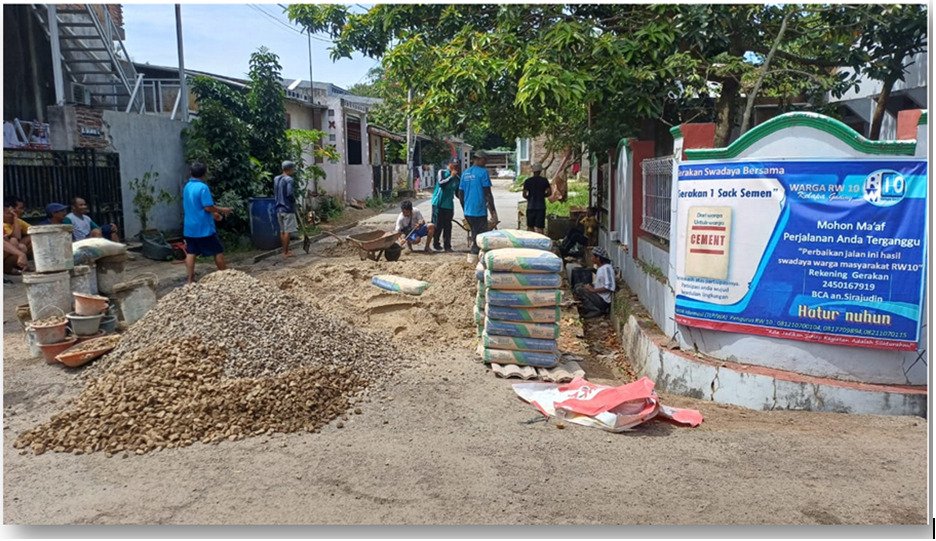 Kegiatan ini sebagai kegiatan perjuangan keikhlasan dalam judul gerakan Gerakan Swadaya 1 Sack Semen, yang merupakan bentuk kepedulian lingkungan dan semangat kebersamaan untuk menumbuhkan rasa memiliki bersama warga dalam memperbaiki fasilitas umum yang rusak.