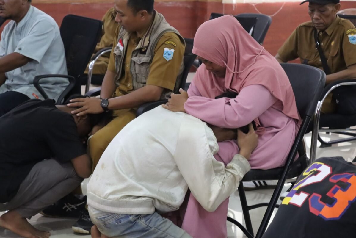 “Minta maaf ya mak, janji enggak bakalan ngulangin lagi,” kata salah satu pelajar sambil bersujud kepada ibunya.