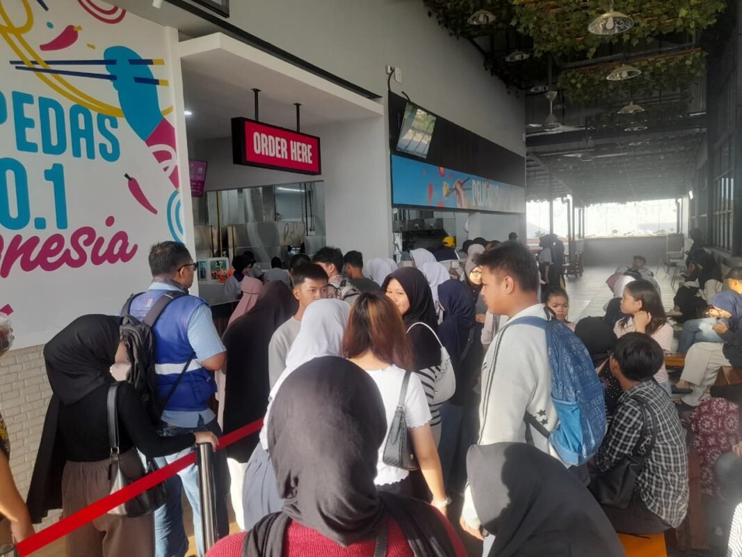 Hakim, warga asal Gunung Santri, Desa Ukirsari, Kecamatan Bojonegara, Kabupaten Serang rela mengantre satu jam lebih untuk mendapatkan mie pedas viral itu.