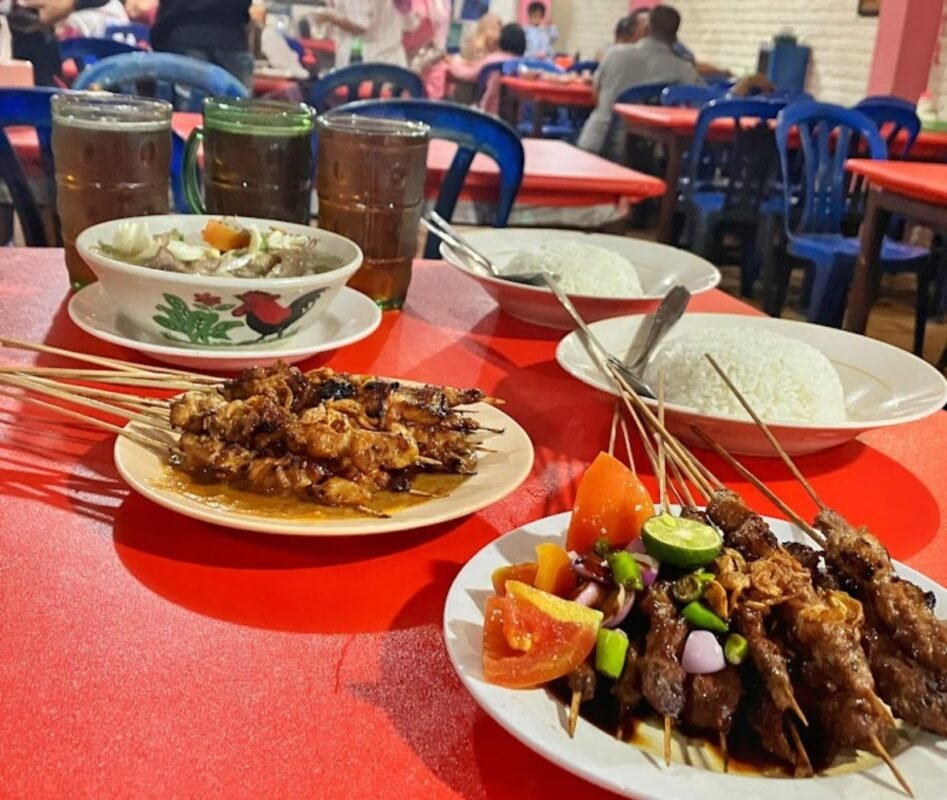 Tersedia menu sate ayam, sate bebek, sate kambing, sate sapi, sop ayam, dan sop sapi.