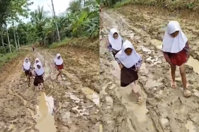 Dalam video terlihat empat pelajar SD melintasi jalan berlumpur di Desa Kutakarang, Kecamatan Cibitung, Kabupaten Pandeglang.
