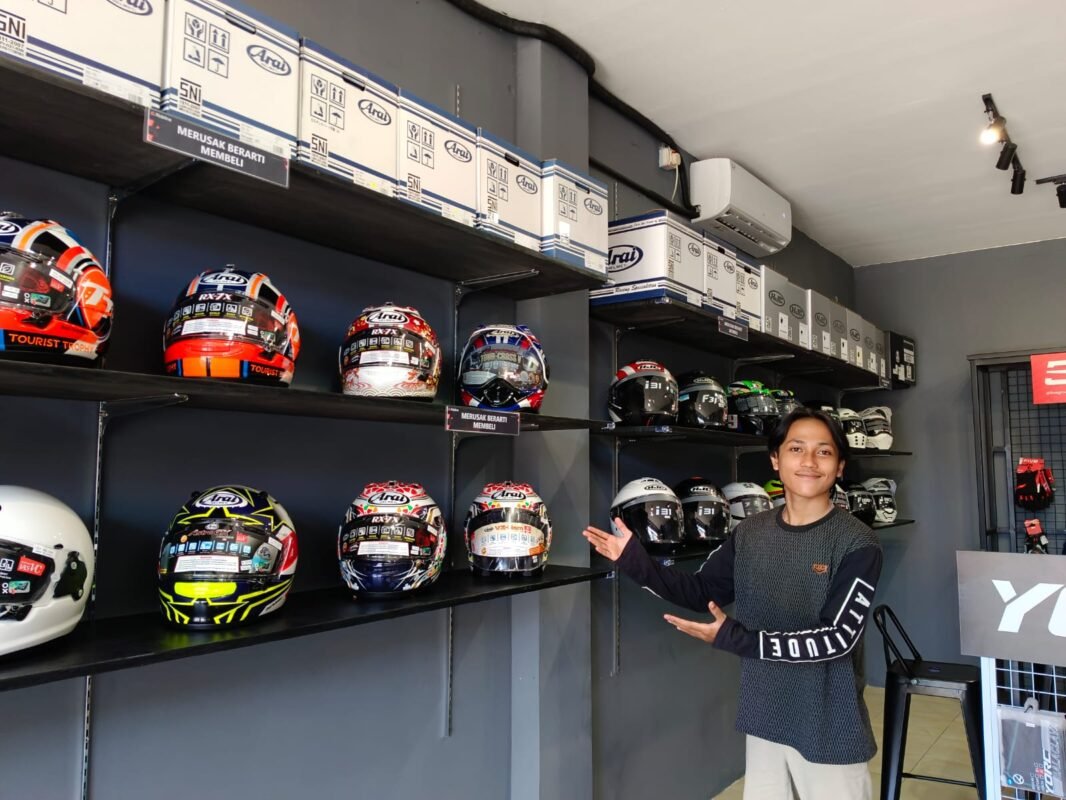“Untuk di helm kita punya produk Arai RX7X Maverick GP5 Rp13 jutaan, ada juga AGV K6 full white, dan untuk yang varian standar HJC F31 F Titanium kisaran Rp10 jutaan,” paparnya.