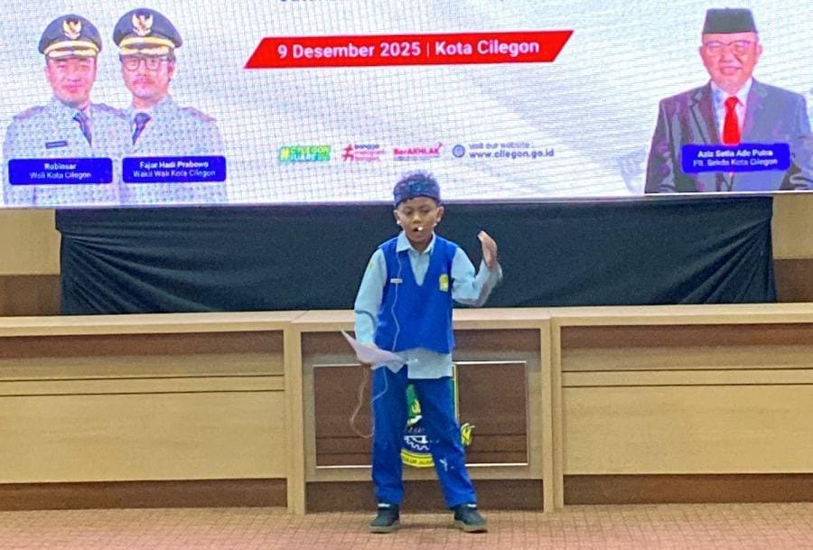 BANTENRAYA.COM – Siswa kelas 6 SDIT Raudhatul Jannah Cilegon Akyas Faiz Ramadhan diundang untuk tampil membaca puisi bertemakan Anti Korupsi di acara Peringatan Hari Anti Korupsi Sedunia atau Hakordia Tahun 2025 Tingkat Kota Cilegon di Aula Setda Kota Cilegon pada Selasa, 9 Desember 2025.