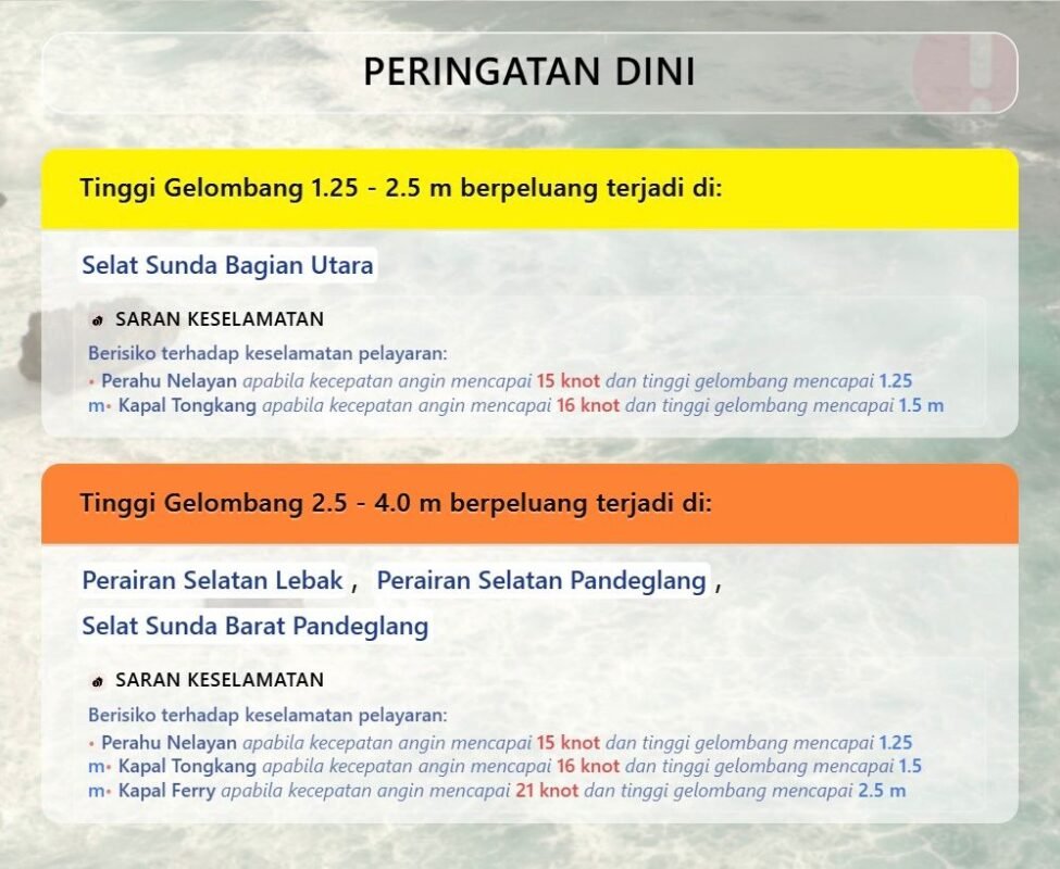 Peringatan dini gelombang tinggi dikeluarkan oleh BMKG berkaitan dengan fenomena astronomis yang dapat meningkatkan ketinggian muka air laut maksimum.
