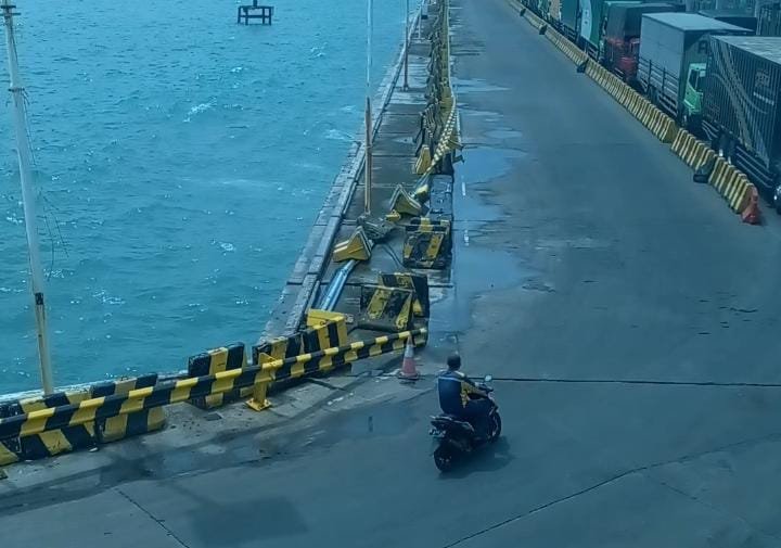Fasilitas tersebut yakni pembatas besi dermaga dan juga bantalan dermaga atau fender rusak akibat gelombang tinggi yang menerjang pada Rabu 3 Maret 2026 kemarin.