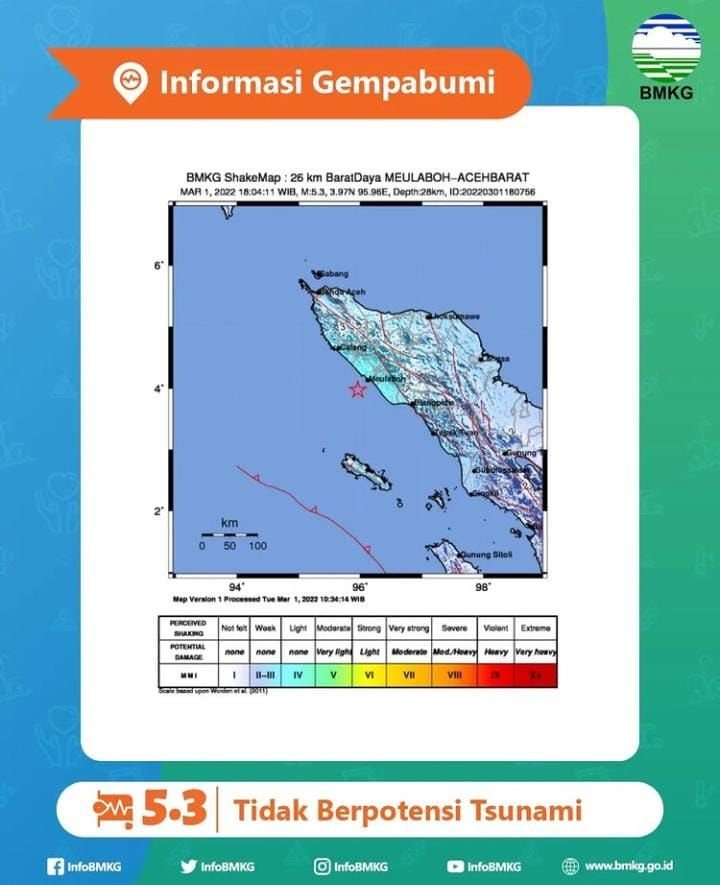 BANTENRAYA.COM- Peristiwa gempa bumi terjadi di Meulaboh, Aceh pada selasa 1 Maret 2022. Hasil analisi BMKG menunjukan bahwa gempa bumi yang terjadi saat ini memiliki parameter update dengan magnitudo 5.3.