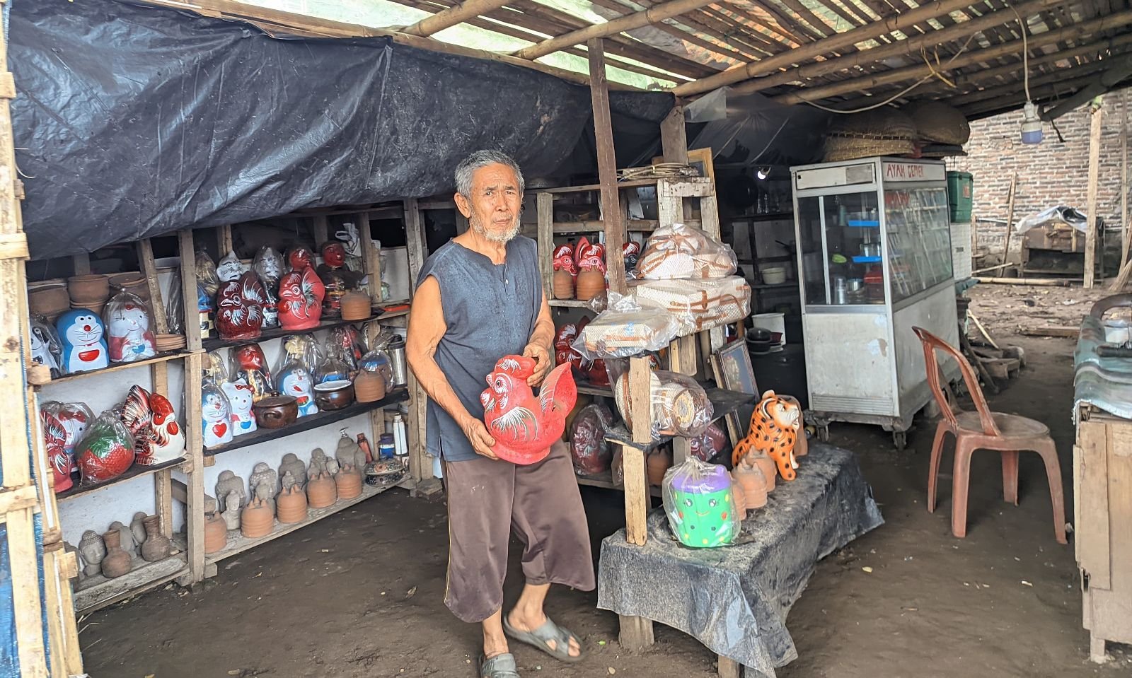 “Saya kan jualnya kerajinan guci dari keramik, celengan dari tanah liat, dan patung-patung tokoh sejarah yang terbuat dari kayu,” katanya.