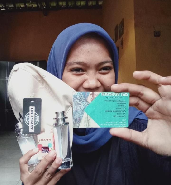 Pemilik Zakymoja Shop Rohmawati memperlihatkan aksesoris dan voucher yang siap dibagikan ke konsumen Dokumentasi