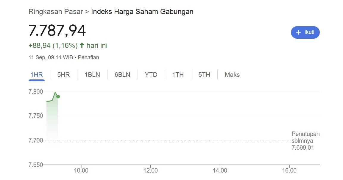 Pada perdagangan sesi pertama pukul 09.00 WIB, IHSG melejit 1,11 persen atau 85,22 poin dari 7.666,01 poin ke angka 7.779,50 poin.