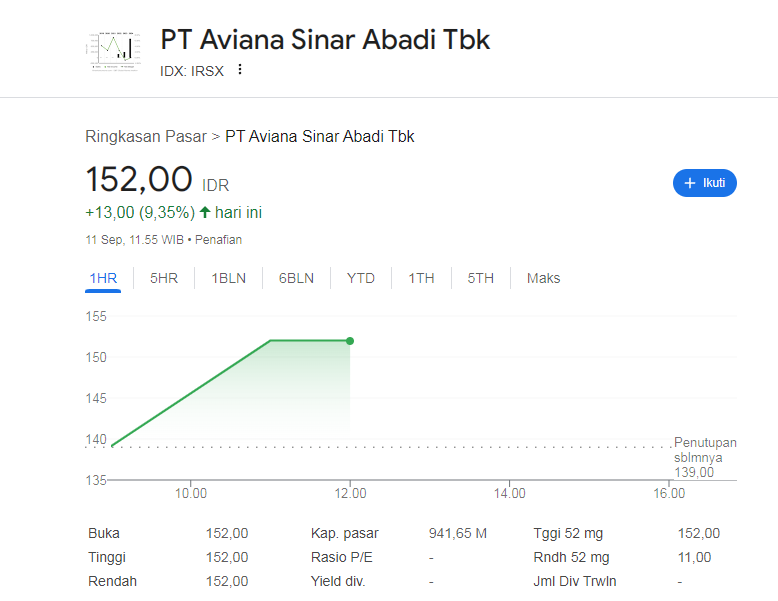 Dalam pembukaan perdagangan bursa Kamis 11 September 2025, saham IRSX mengalami peningkatan 13 poin dari Rp140 per lembar saham,