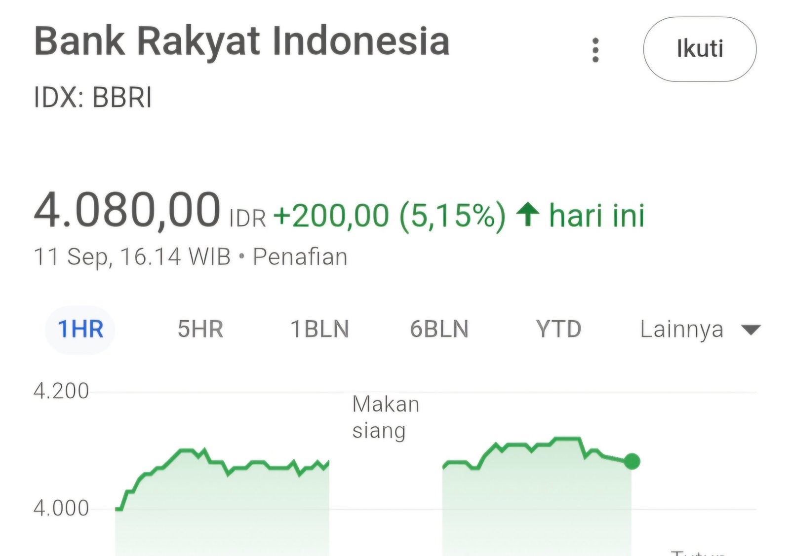 Kurva harga saham BBRI yang mengalami lonjakan setelah Menteri Keuangan Purbaya Yudhi Sadewa akan mengucurkan Rp200 triliun untuk Himbara.