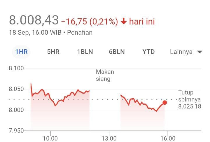Diketahui, Indeks Harga Saham Gabungan (IHSG) pada Kamis 18 September 2025 mengalami koreksi atau turun 0,21 persen ke level 8.008 di sesi penutupan.