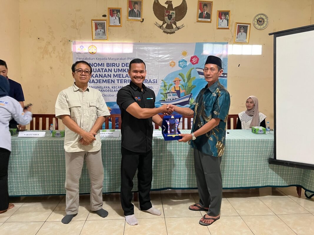 Koordinator Rumah BUMN Serang Yudi Guntara secara simbolis memberikan cendramata program BRI kepada perwakilan UMKM di Desa Tanjung Jaya, Pandeglang, Minggu 26 Oktober 2025. (Dok/BRI Serang)