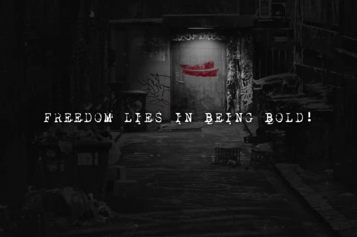 Kalimat selanjutnya adalah, “Freedom lies in being bold” yang artinya “Kebohongan kebebasan dibuat tebal”.