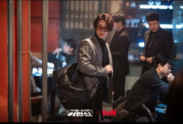 Adegan lainnya, Lee Han Shin terlihat duduk di sebuah meja judi dengan penampilan yang sangat berbeda.