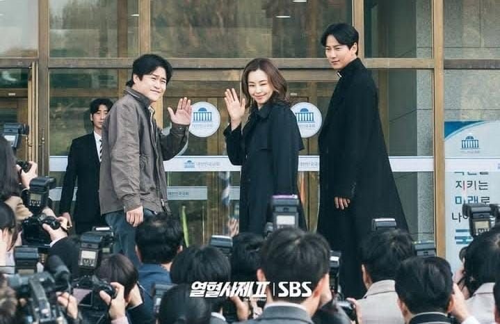 Menjelang sidang digelar, Kim Hae Il, Park Kyung Sun dan Goo Dae Young saling bertukar pandang dengan penuh tekad.