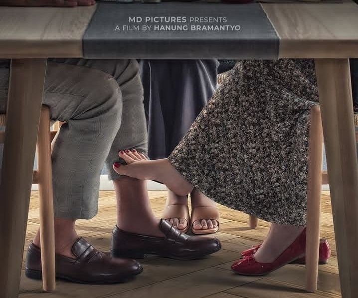 Salah satu kaki milik seorang perempuan secara diam-diam menyentuh bagian kaki sang laki-laki.
