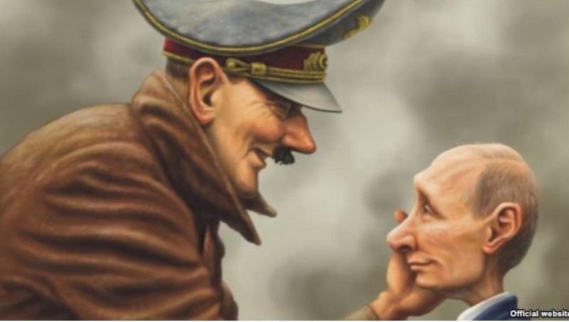 Karikatur Adolf Hitler dan Presiden Rusia Vladimir Putin tersebut memperlihatkan bahwa keduanya saling memandang mesra dan diduga menjadi gambaran krisis di Ukraina saat ini.